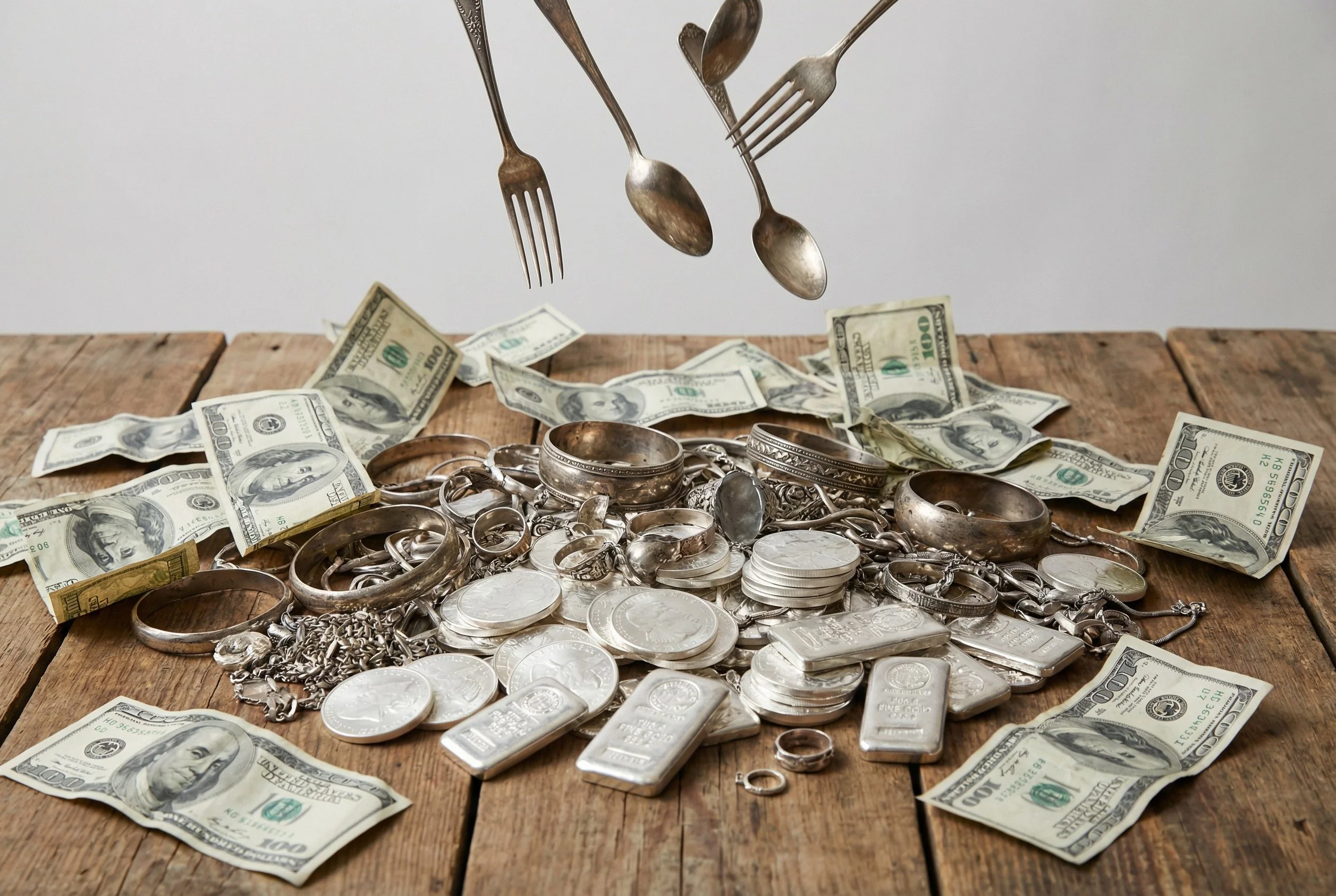 We pay cash for sterling flatware, jewelry, pure silver ounces, and more